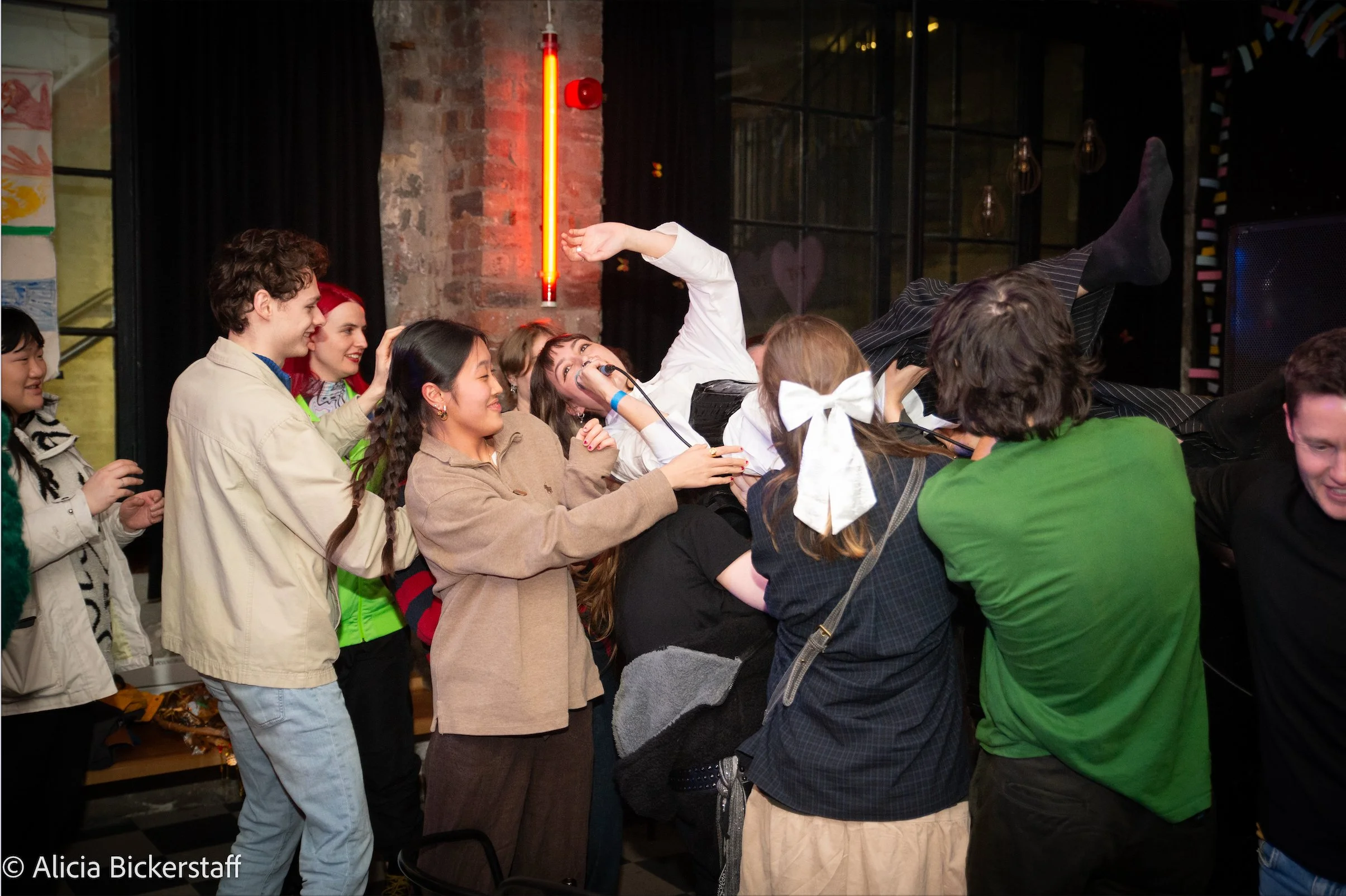 Everyone was seated and therefore asked to stand, from this they had unknowingly opted into participation (despite not knowing what for) rather than having to choose to participate previously. Also the audience here was majority art students and a supportive queer community, compared to the mix of ages in the Degree Show.