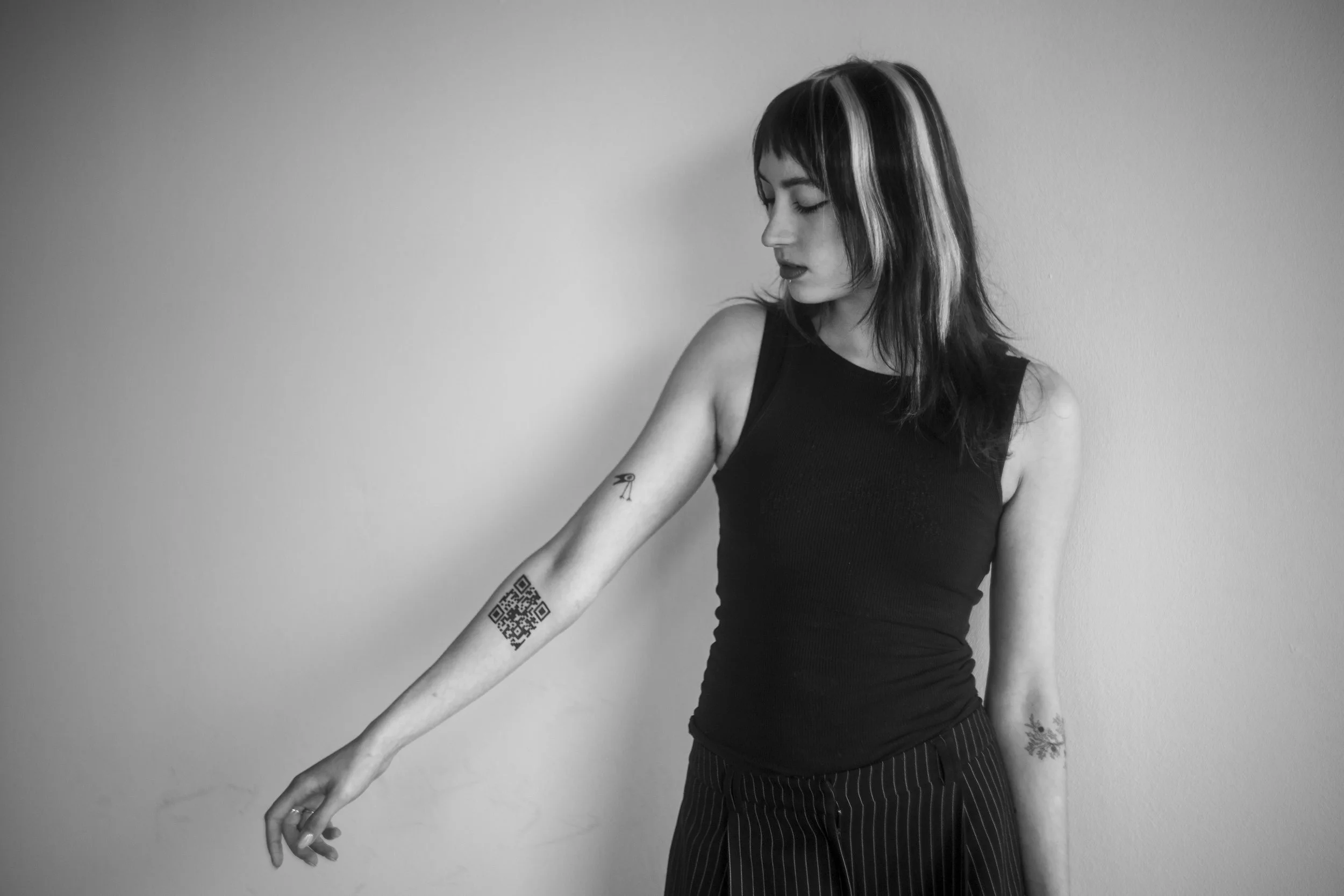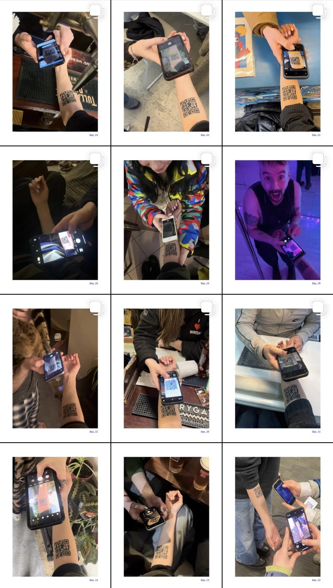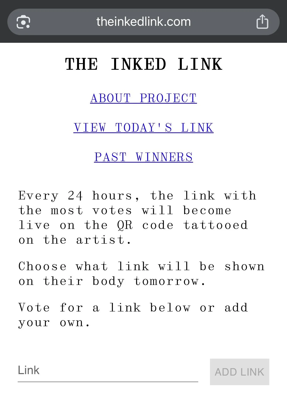 A QR code is tattooed on the artist's body, and is controlled entirely by a website www.theinkedlink.com/voting